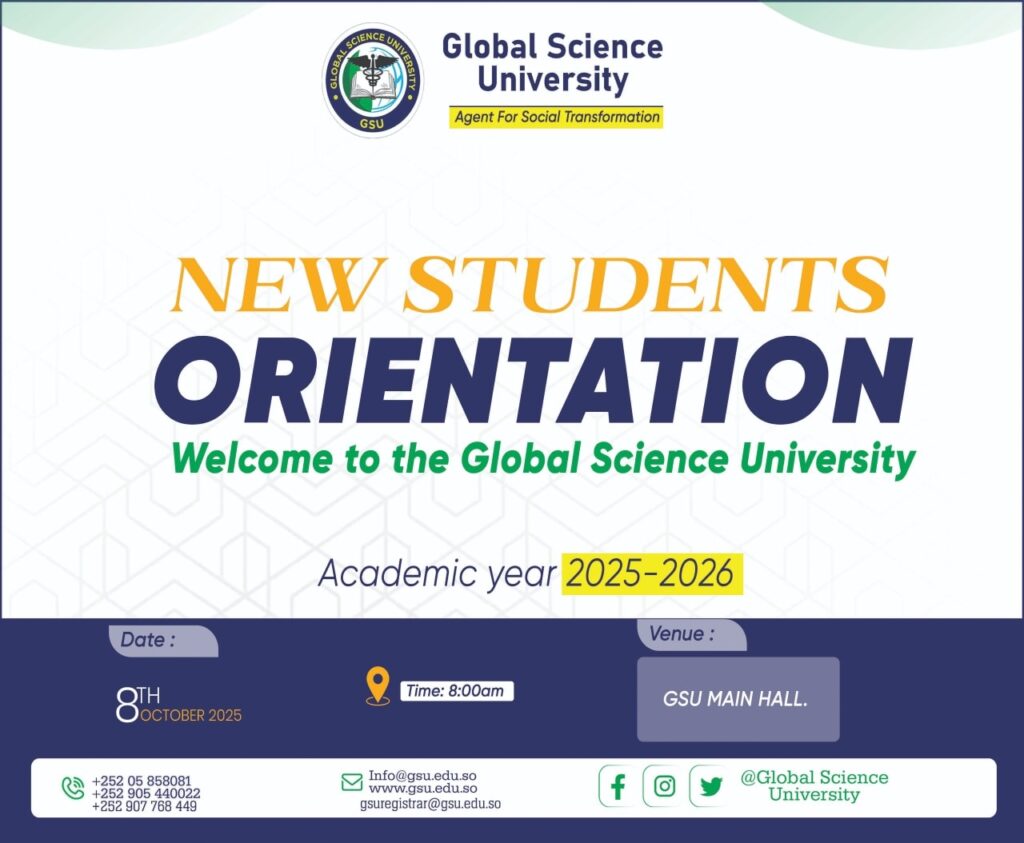 Home / Posts/ Events News NEW STUDENTS ORIENTATION Today, on the 8th of October, 2025, we held the New Students Orientation for the academic year 2025/2026.The event, which was organized to a high standard, took place at the Global Science University – GSU hall. The new students were warmly welcomed, given guidance, and provided with a roadmap for their academic journey ahead. The orientation session was attended by Dr. Abdulkadir Mohamud Jama (Dhagacadde), the president of the university, along with other university leaders, faculty members, and distinguished guests. During the event, they shared valuable words of welcome, encouragement, and advice with the new students, emphasizing the importance of hard work, dedication, and academic excellence. This session also included discussions on: The university’s mission and values. Expectations for students and how to excel in their studies. Available academic support and resources for success. Campus life, extracurricular activities, and student clubs. We believe that this event has set the right tone for the new academic year, ensuring that the students are well-informed, motivated, and ready to embark on their educational journey at Global Science University – GSU. Global Science University – GSU#orientationday 2025/2026