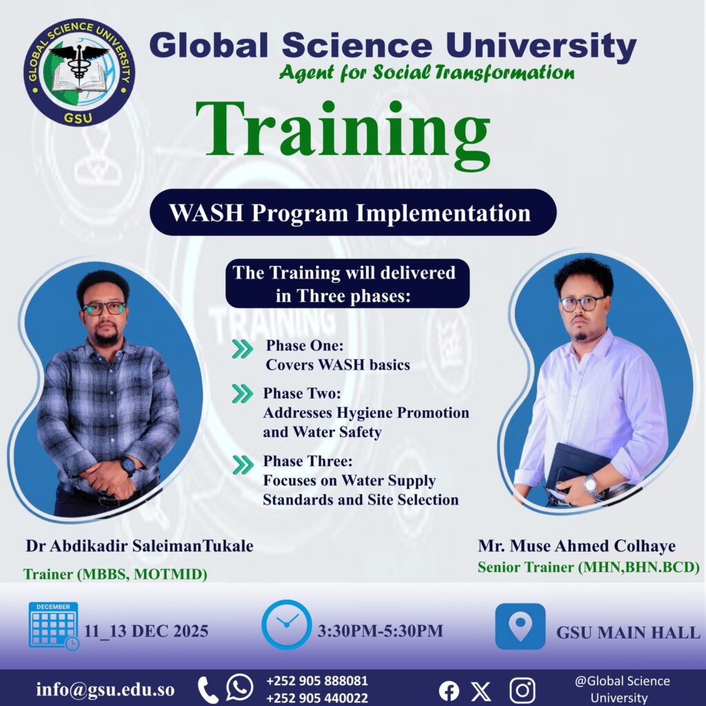 Home / Posts/ Events News WATER SANITATION AND HYGIENE (WASH) TRAINING This training program is designed to strengthen the capacity of students to effectively manage and implement WASH initiatives aimed at improving community health and reducing diseases related to poor sanitation and hygiene. Through this training, participants will gain essential skills in health promotion, safe water practices, hygiene awareness, and community sanitation improvement. The program will also highlight practical strategies for preventing common WASH-related illnesses and creating healthier living environments. The training will take place from December 11th to 13th, 2025.For additional information or registration, please contact the training registration office. #washprograms #healthpromotion #improvingsanitationGlobal Science University – GSU